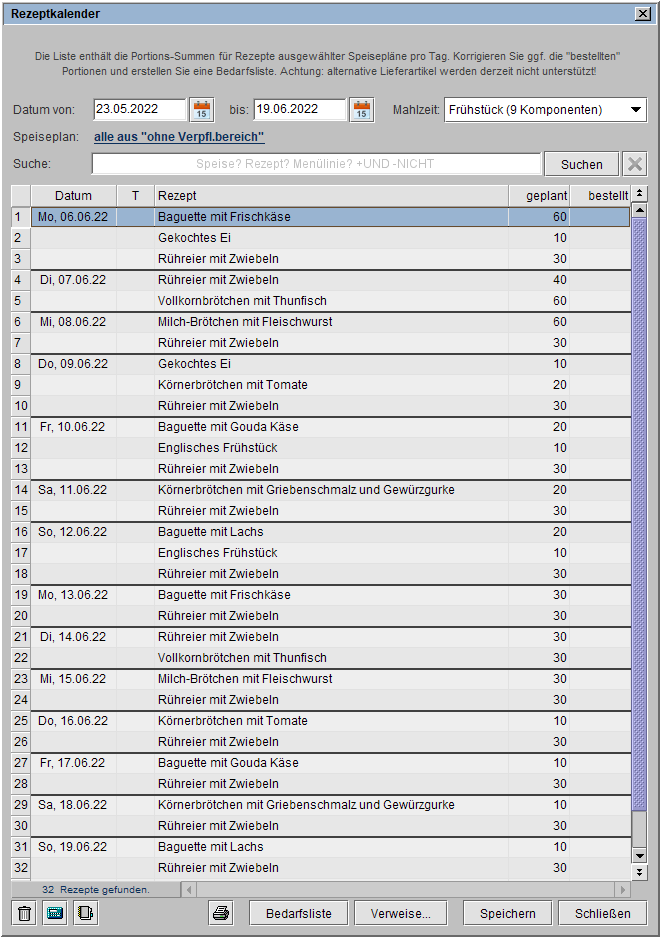 als heute + Sperrtage sind, werden nicht aktualisiert. Neu angelegte Speisen werden auch dem Rezeptkalender für zukünftige Tage hinzugefügt. Bei vorhandenen Speisen werden die Portionszahlen aktualisiert.