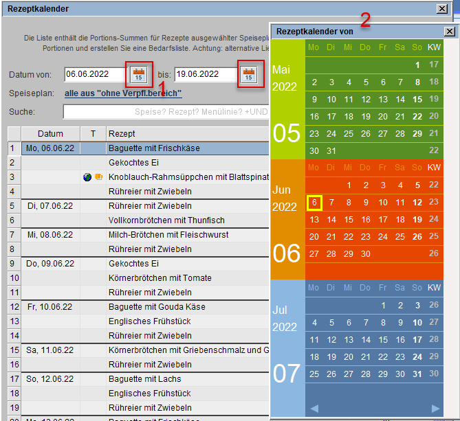 Erweitern oder schränken Sie den Zeitraum ein, den die Liste des Rezeptkalenders berücksichtigen soll.