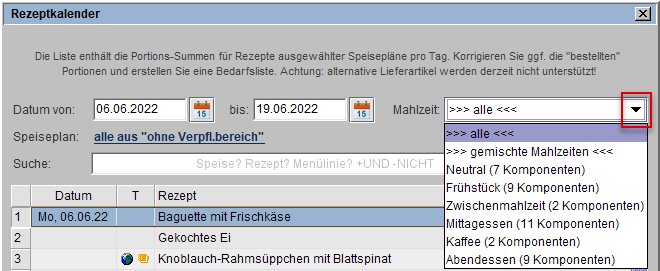 Die Voreinstellung ist hier der Eintrag alle Mahlzeiten (>>> alle <<<).