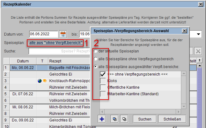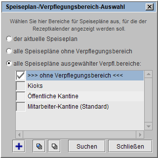 Welche Speisepläne, entsprechend ihrer Zuordnung zu einem Verpflegungsbereich, für die Rezeptliste im Rezeptkalender berücksichtigt werden, definieren Sie mit Auswahl eines