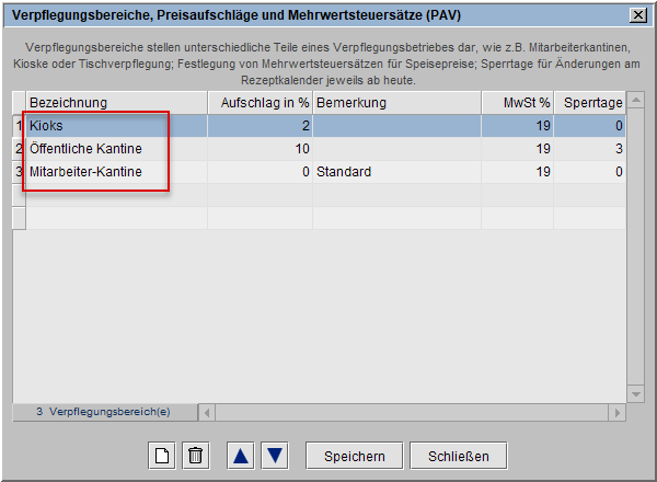 Sie sehen genau die Verpflegungsbereiche, die Sie definiert haben (s. Dialog rechts).