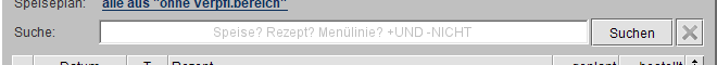 | Speiseplan | der aktuelle (geöffnete) Speiseplan | Alle aus >>ohne Verpflegungsbereich<<< | ||
