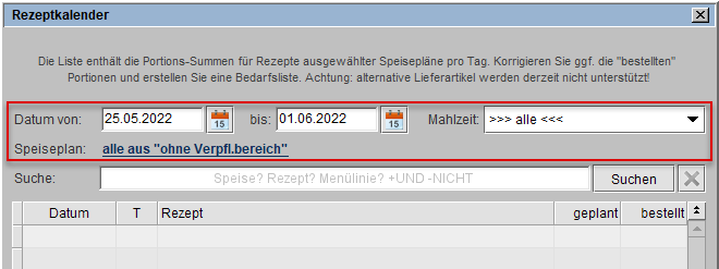 Mit Klick auf die Schaltfläche [Suchen] starten Sie das Erstellen der Rezeptliste des Rezeptkalenders entsprechend den gesetzten Einschränkungen neu.
