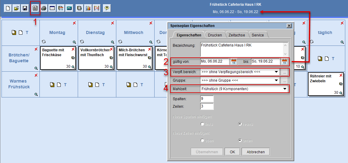 | Datum von…bis | Gültigkeitszeitraum des geöffneten Speiseplanes | Morgen plus 7 Tage | ||