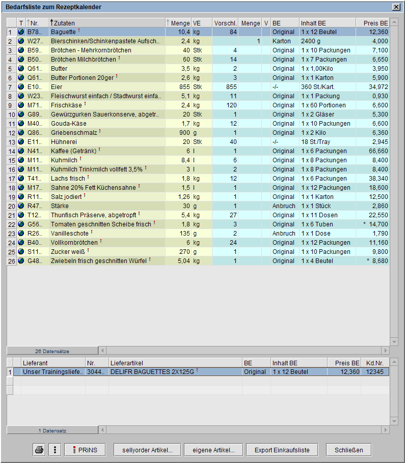 Rezepte mit alternativen Lieferartikeln werden derzeit nicht berücksichtigt. Es wird eine spezielle Bedarfsliste für den Rezeptkalender erstellt.