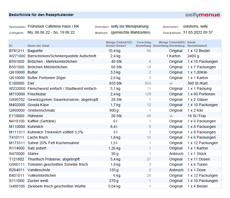 Sie unterscheidet sich von der Bedarfsliste für den Speiseplan nur geringfügig: