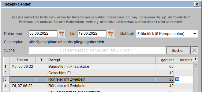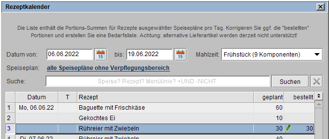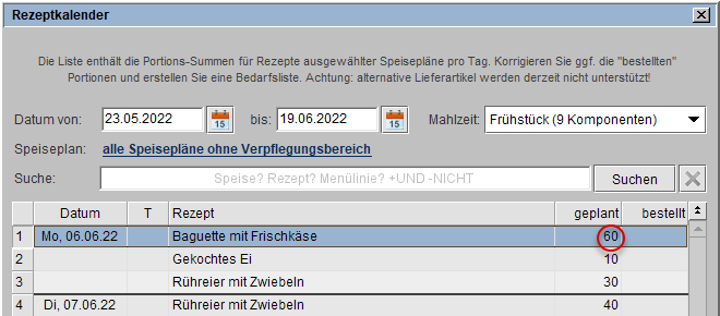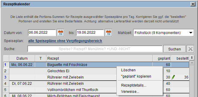 In der Spalte geplant wird die aufsummierte Planzahl als Positions-Summen für ein Rezept der ausgewählten Speisepläne pro Tag.
