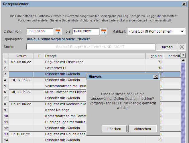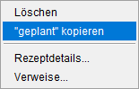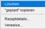 Um eine Position aus der Rezeptliste des Rezeptkalenders zu entfernen, bspw. weil diese für die Bedarfsliste irrelevant ist, nutzen Sie den Eintrag Löschen, erhalten