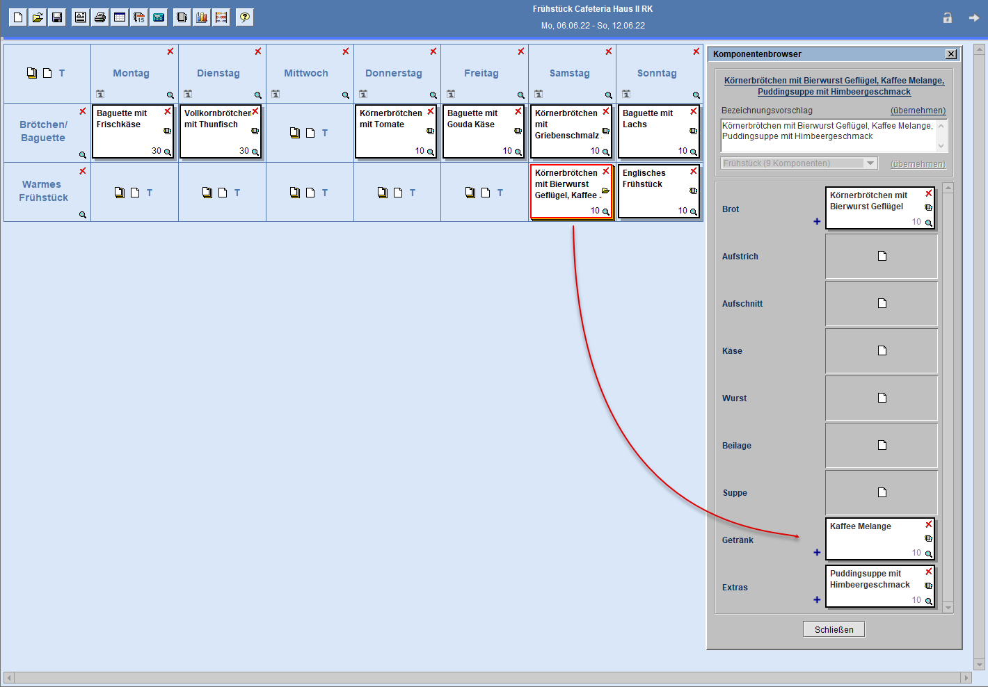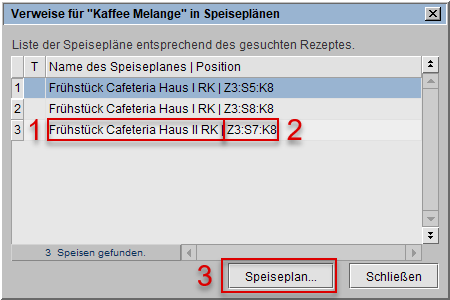 Im Beispiel ist das Rezept in zwei Speiseplänen zugeordnet worden, dabei in dem Plan Frühstück Cafeteria Haus I RK 2x.