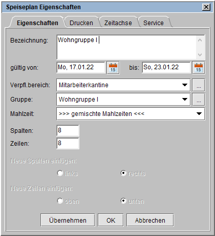 Sie vergeben eine Bezeichnung, legen den Gültigkeitszeitraum fest, wählen einen Verpflegungsbereich,