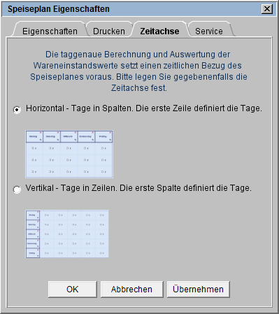 Bitte legen Sie die Zeitachse fest, das bedeutet, Sie definieren, ob die Wochentage waagerecht oder senkrecht erfasst werden.
