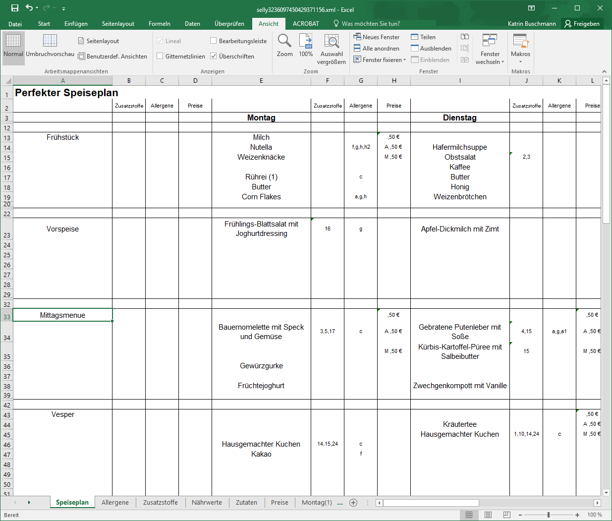 Der Ausdruck des Speiseplanes im Excel-Format erfolgt ohne weitere Schritte.
