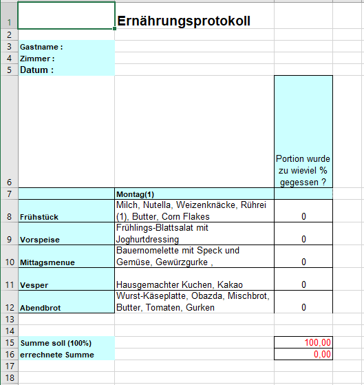 Die Spalte Portion wurde zu wieviel Prozent gegessen? muss vom Erfasser ausgefüllt werden.