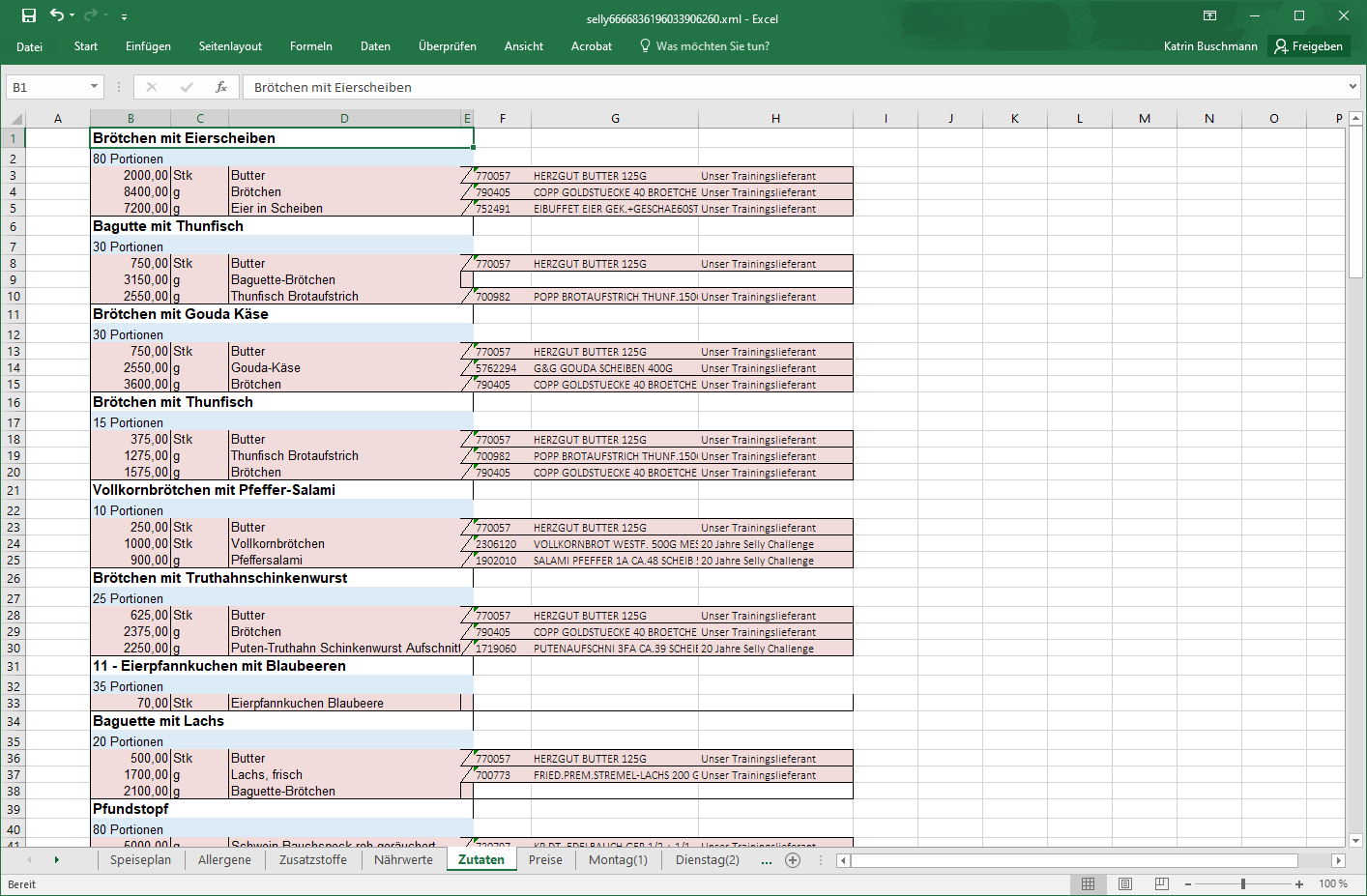 des Speiseplans im Arbeitsblatt Zutaten zusätzlich die im
