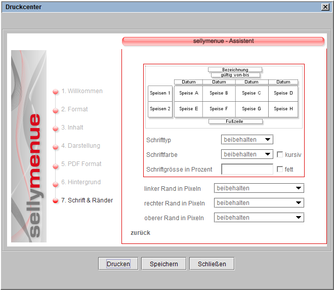 Die Änderung der Schriftgröße erfolgt immer prozentual zur Ausgangsgröße. Sie geben den entsprechenden Prozentwert in das Feld ein. Sollten die Angaben des Speiseplans zu groß sein und damit bspw. den gewählten Hintergrund überdecken, schließen Sie die Druckansicht und ändern den Wert, bis der Druck auf das gewählte Hintergrundbild passt.