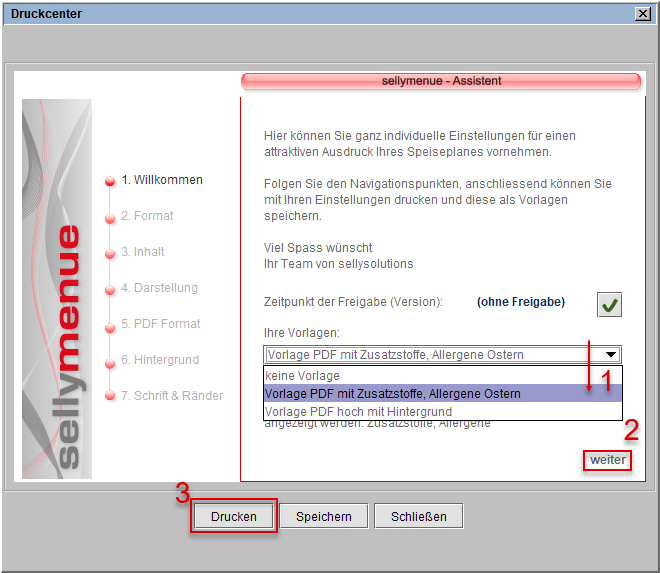 Sie wählen aus der Vorlagenliste die entsprechende Vorlage aus (s. Markierung 1) und können sofort danach den Druckvorgang für Ihren Speiseplan mittels Schaltfläche [Drucken] starten (s. Markierung 3) .
