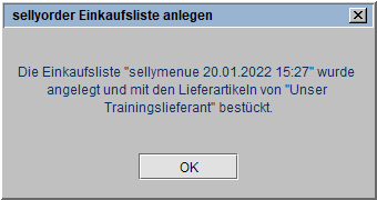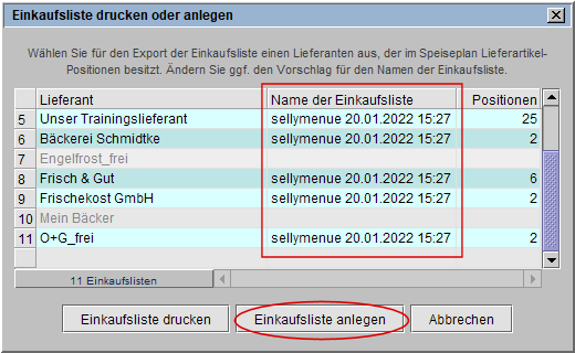 Der Name der Einkaufsliste kann zuvor geändert werden. Klicken Sie dazu in die Spalte Name der Einkaufsliste (s. Markierung) und überschreiben den Vorschlag z. B. sellymenue 20.01.2022 15:27.