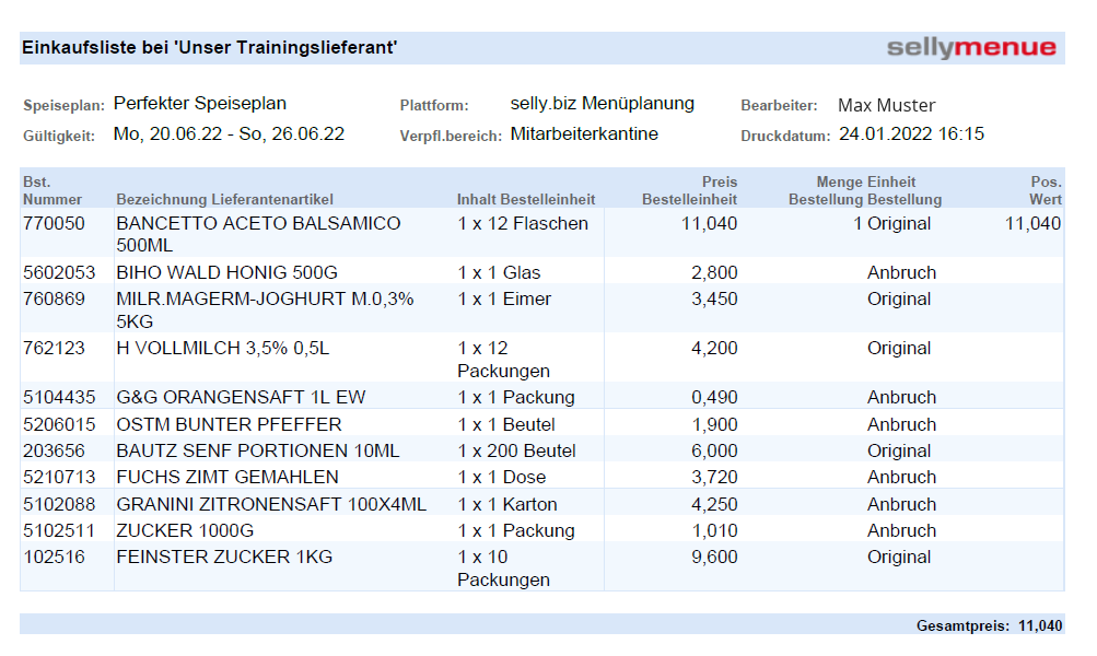 Bei Klick auf [Export Einkaufliste] im Dialog Bedarfsliste erhalten Sie die Möglichkeit Einkaufslisten anzulegen und auszudrucken.