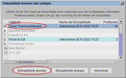 Sie markieren den Lieferanten, für den Sie die Einkaufsliste