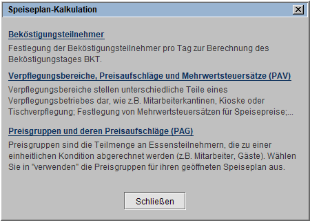 Sie legen die Anzahl der Beköstigungsteilnehmer fest und können bereichs- und gruppenweise kalkulieren. Dazu erfassen Sie entsprechende Verpflegungsbereiche und legen Preisgruppen, Mehrwertsteuersätze und Sperrtage fest.