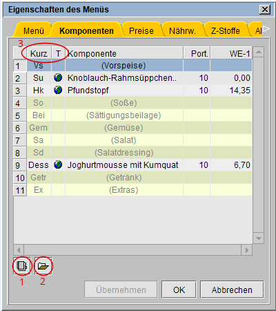 Entsprechend der gewählten Mahlzeit (Menütyp) sehen Sie vor jedem Rezeptnamen, zuerst die Kurzbezeichnung der Einzelkomponente in der Spalte Kurz und in der Spalte T finden Sie einen Hinweis auf dessen Herkunft (Rezepttyp) (s. Markierung 3).