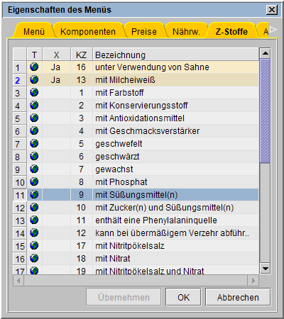 Bilden mehrere Speisen ein Menü, wird in den gleichnamigen Reitern im Eigenschaftsdialog des Menüs die Summe der Zusatzstoffe aller