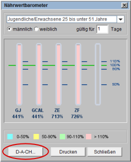 Um andere oder weitere Referenzgruppen und Nährwerte in die Anzeige einzubeziehen, klicken Sie jeweils auf [D-A-CH].