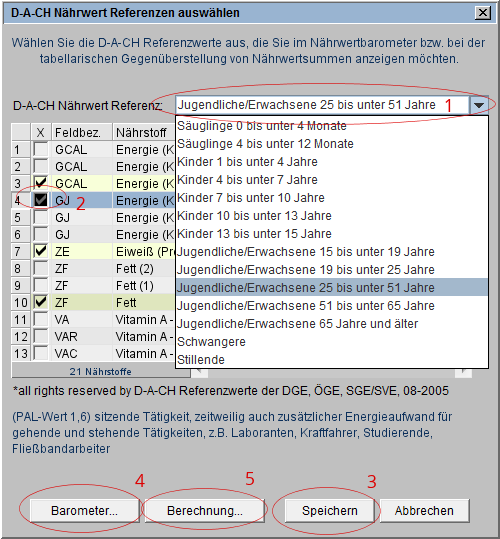 zuerst eine entsprechende D-A-CH Nährwert Referenz aus der Liste (s. Markierung 1) und markieren anschließend die Nährstoffe in der Tabelle (s. Markierung 2).