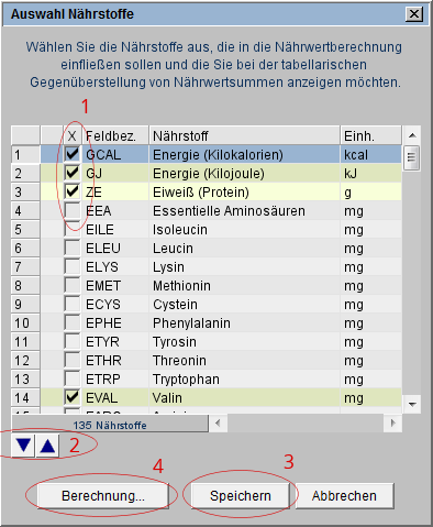 Um andere oder weitere Nährstoffe (s. Markierung 4) in die Anzeige einzubeziehen, klicken Sie auf [Nährstoffe...].