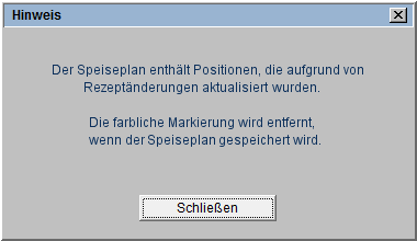 Der rosa Rahmen erscheint nach dem Öffnen des Speiseplanes als Kontroll-Kennzeichen, dass Änderungen am Rezept stattgefunden haben. Außerdem wird folgender Hinweis ausgegeben: