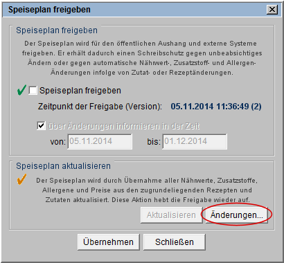 Die während des Aktualisierens vorgenommen Änderungen werden protokolliert und können im Freigabedialog über die Schaltfläche [Änderungen…] (s. Markierung) eingesehen und ggf. gedruckt werden.