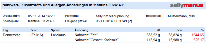 Das LMIV-Änderungsprotokoll beinhaltet komplett die Änderung der Deklaration des Speiseplanes, d. h. es werden auch manuelle Rezeptänderungen protokolliert, wenn sie den