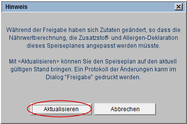 Mit Klick auf [Aktualisieren] (s. Markierung) werden die Speiseplandaten hinsichtlich Zutatenänderungen aktualisiert.