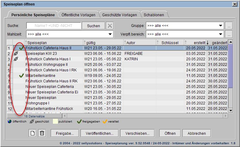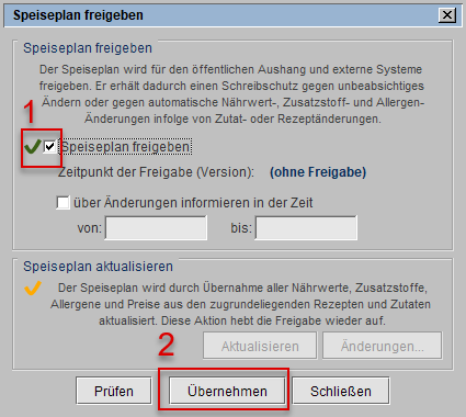 Markierung 1) kann ein Speiseplan freigegeben oder die Freigabe wieder aufgehoben werden.