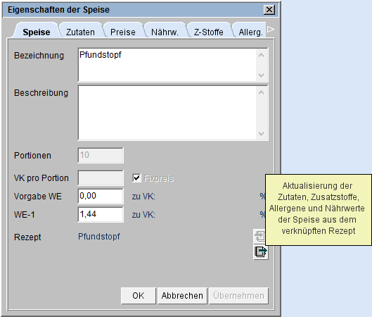 Dafür steht weiterhin die gleichnamige Schaltfläche im Reiter Speise des Dialogs Eigenschaften der Speise zur Verfügung.