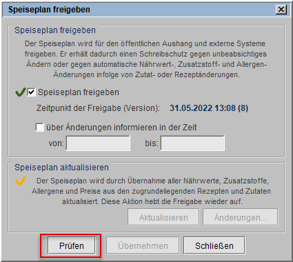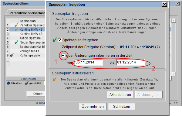 und ein Informationszeitraum definiert (s. l. Markierung 2), wird beim Öffnen eines freigegebenen Speiseplanes geprüft, ob Änderungen aktualisiert werden sollten.