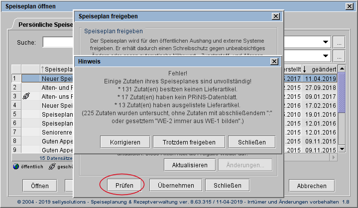 Wenn der Speiseplan Fehler enthält, kann über die [Korrigieren]-Schaltfläche die Bedarfsliste aufgerufen werden, in der nur Zutaten enthalten sind, die keine Lieferartikel und/oder kein PRiNS-Datenblatt besitzen. Mit Klick auf [Trotzdem freigeben] wird der Speiseplan auch mit Fehlern freigegeben.