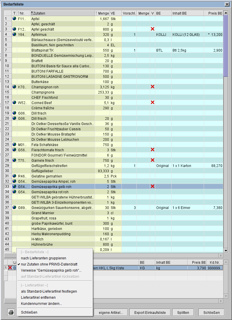 Die Optionen nach Lieferanten gruppieren und nur Lieferartikel ohne PRiNS-Datenblatt sind automatisch eingeschaltet. Es werden keine Zutaten mit abschließendem ":" mehr angezeigt, da diese als