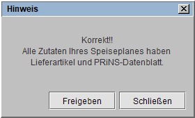 Ist die Speiseplan-Prüfung ohne Fehler durchgelaufen, erscheint dieser Dialog, in dem der Nutzer die Freigabe des Speiseplanes sofort durchführen kann. Nach der Freigabe mit Klick auf [Freigeben], werden alle Dialoge geschlossen.
