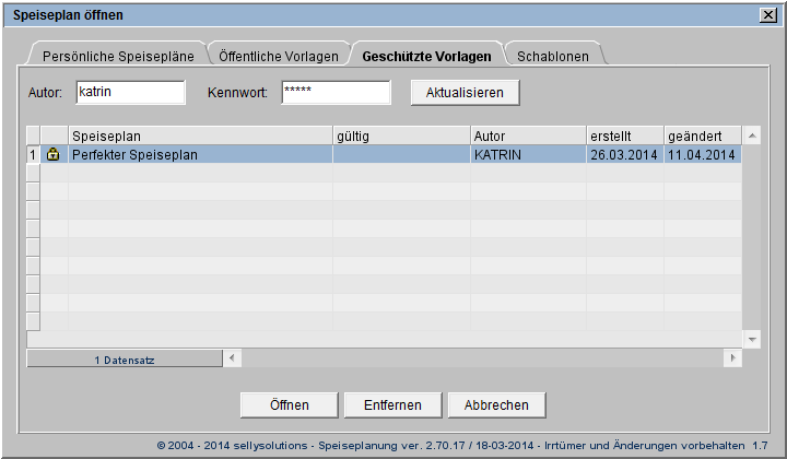 Zum Öffnen und Einbinden einer geschützten Speiseplanvorlage nutzen Sie das