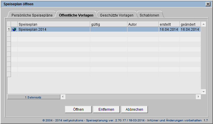 Markieren Sie die Speiseplan-Vorlage in der Liste und klicken auf [Öffnen].