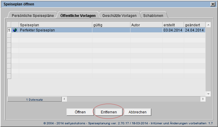 Sie öffnen den Dialog Speiseplan öffnen, wechseln in das Reiter Öffentliche bzw. Geschützte Vorlagen und markieren den Plan, für den Sie die Veröffentlichung aufheben möchten.