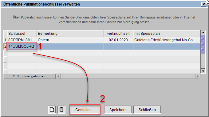 Zur Festlegung der Darstellungsparameter wählen Sie zuerst den Schlüssel aus (s. Markierung 1) und nutzen dann die Schaltfläche [Gestalten...] (s. Markierung 2).