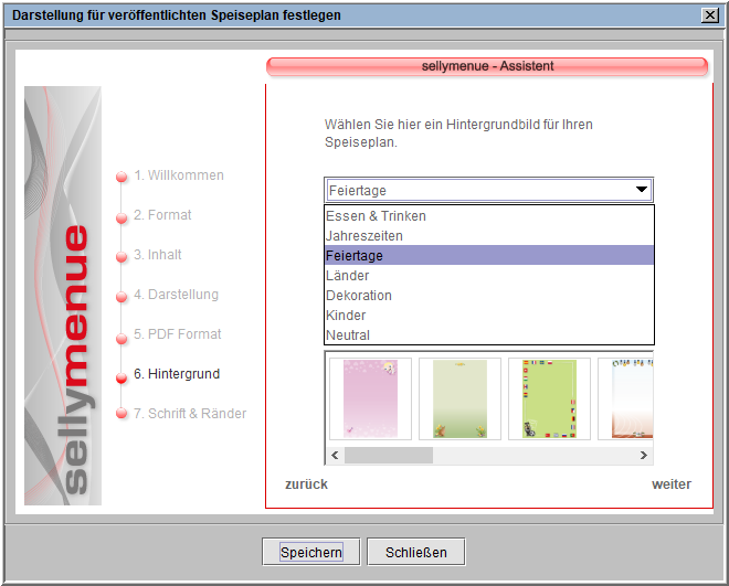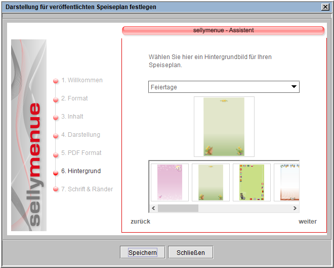 s. a. Schritt 1 (Einstieg) Schritt 2 (Auswahl HTML- oder PDF-Format) Schritt 3 (Auswahl zusätzlicher Infos (Zusatzstoffe, Nährwerte, VK-Preise)) Schritt 4 (Auswahl Tabellenansicht/Liste) Schritt 5 (Auswahl Seitenformat/Ausrichtung; nur für PDF-Format) Schritt 7 (Auswahl Schrifteigenschaften/Rand)