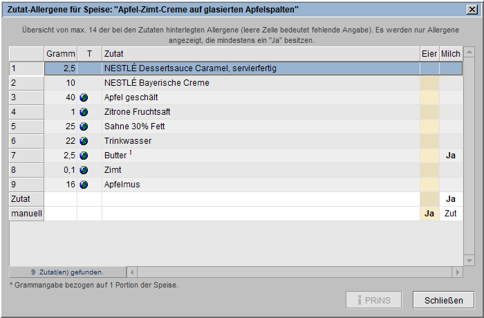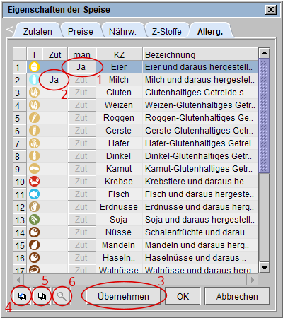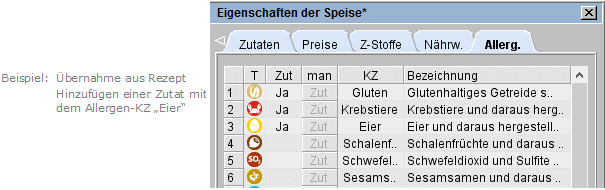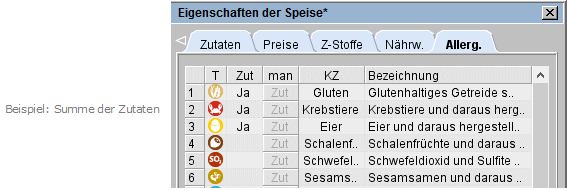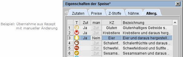 Bringen das Rezept bzw. eine Zutat bereits ein Allergen mit, werden diese Allergene in der Spalte man bzw. Zut ausgewiesen (s. Markierung 1 bzw. 2).