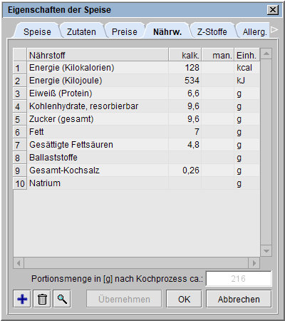 In der Spalte kalk. erhalten Sie die automatische Addition der Nährwerte der einzelnen Zutaten.