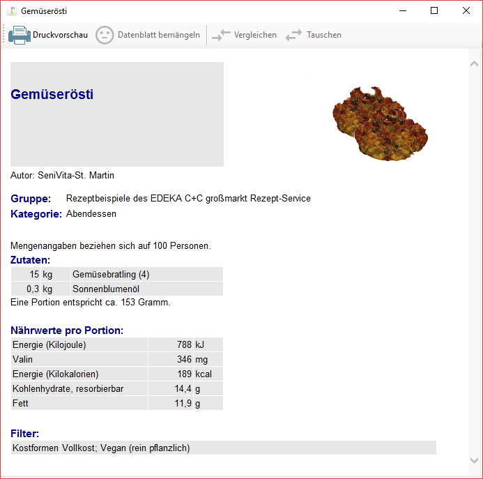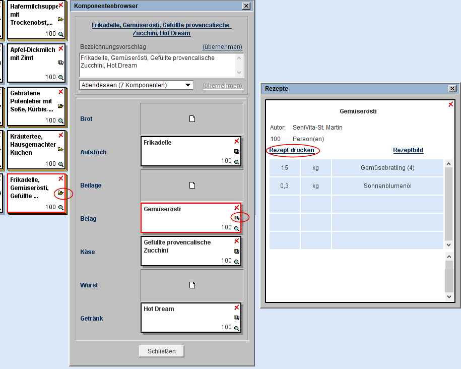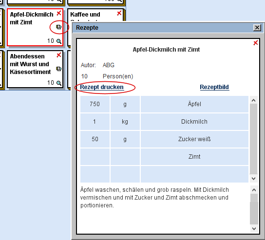 In der Speiseplanzelle klicken Sie auf das Rezeptbuch-Symbol und erhalten die Rezeptübersicht. Mittels Link Rezept drucken öffnet sich die Bildschirmdruckansicht.