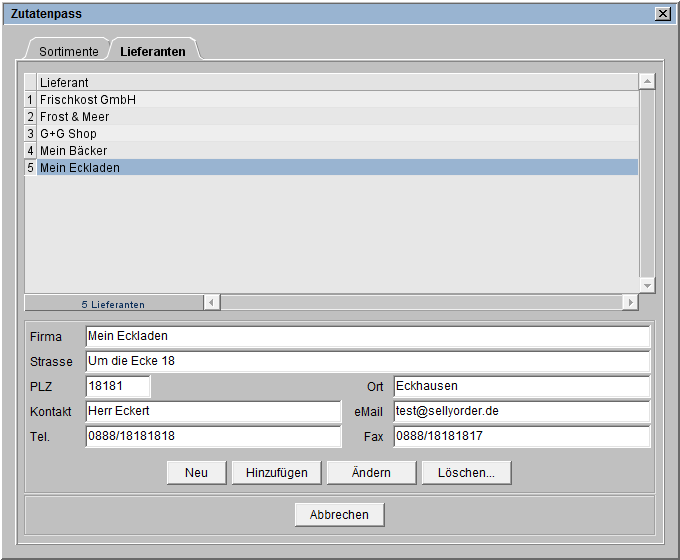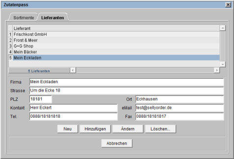 Zum Ändern von Daten markieren Sie den Lieferanten in der oberen Liste, nehmen in den unteren Feldern entsprechende Änderungen vor und speichern die Daten mit Klick auf [Ändern].