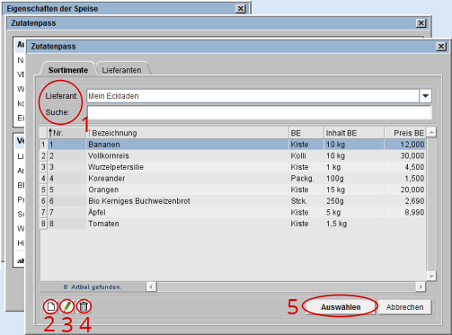 Öffnen Sie den Dialog Zutatenpass, sehen Sie alle durch Sie bereits angelegten Lieferanten und jeweils die erfassten Artikel.
