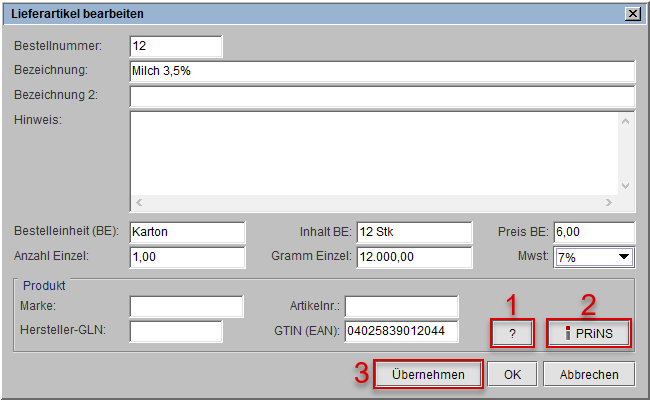 (s. o. Markierung 3) der Bearbeitungsdialog Lieferartikel bearbeiten. Sie können die Daten des Lieferartikels ändern.